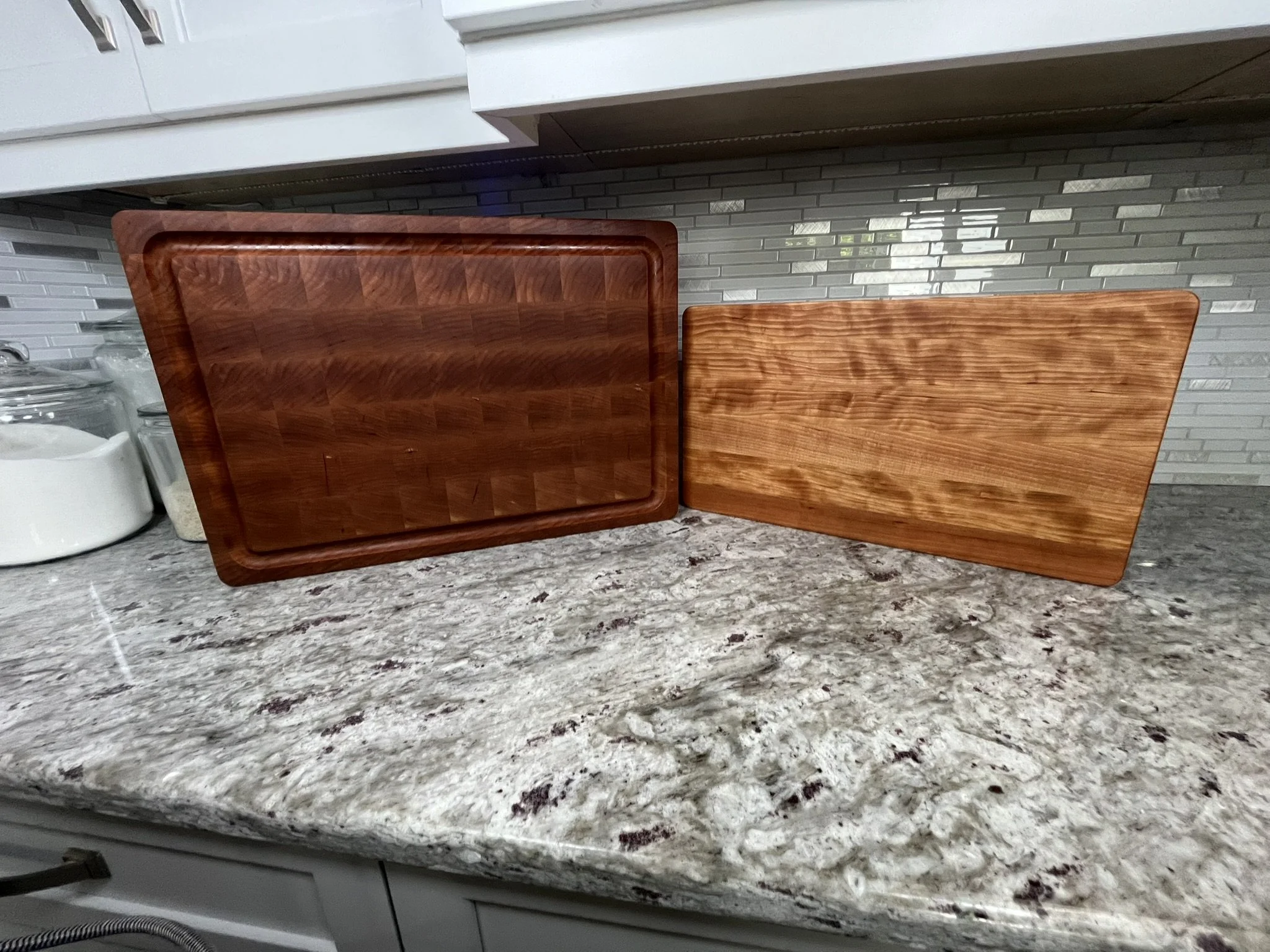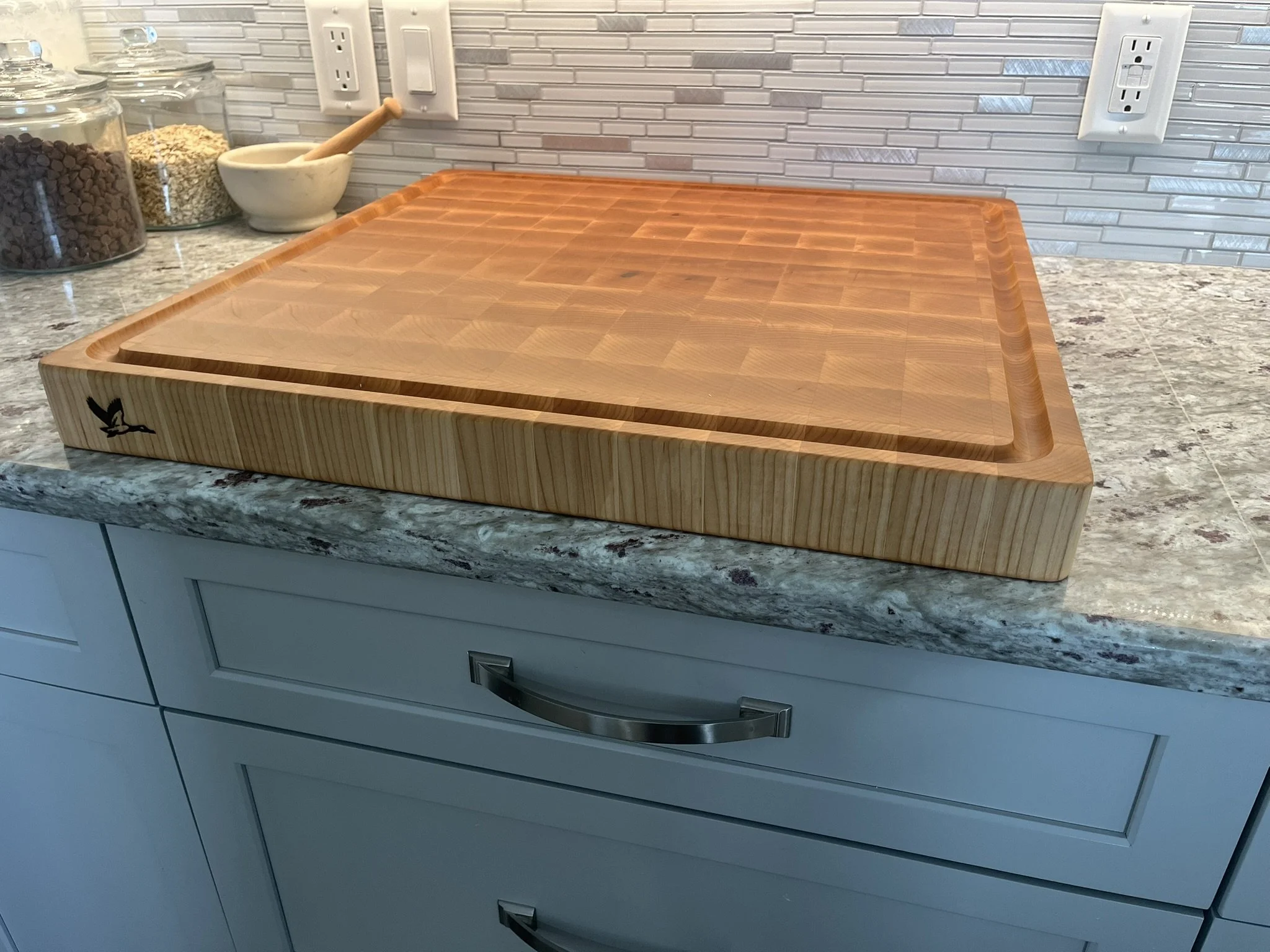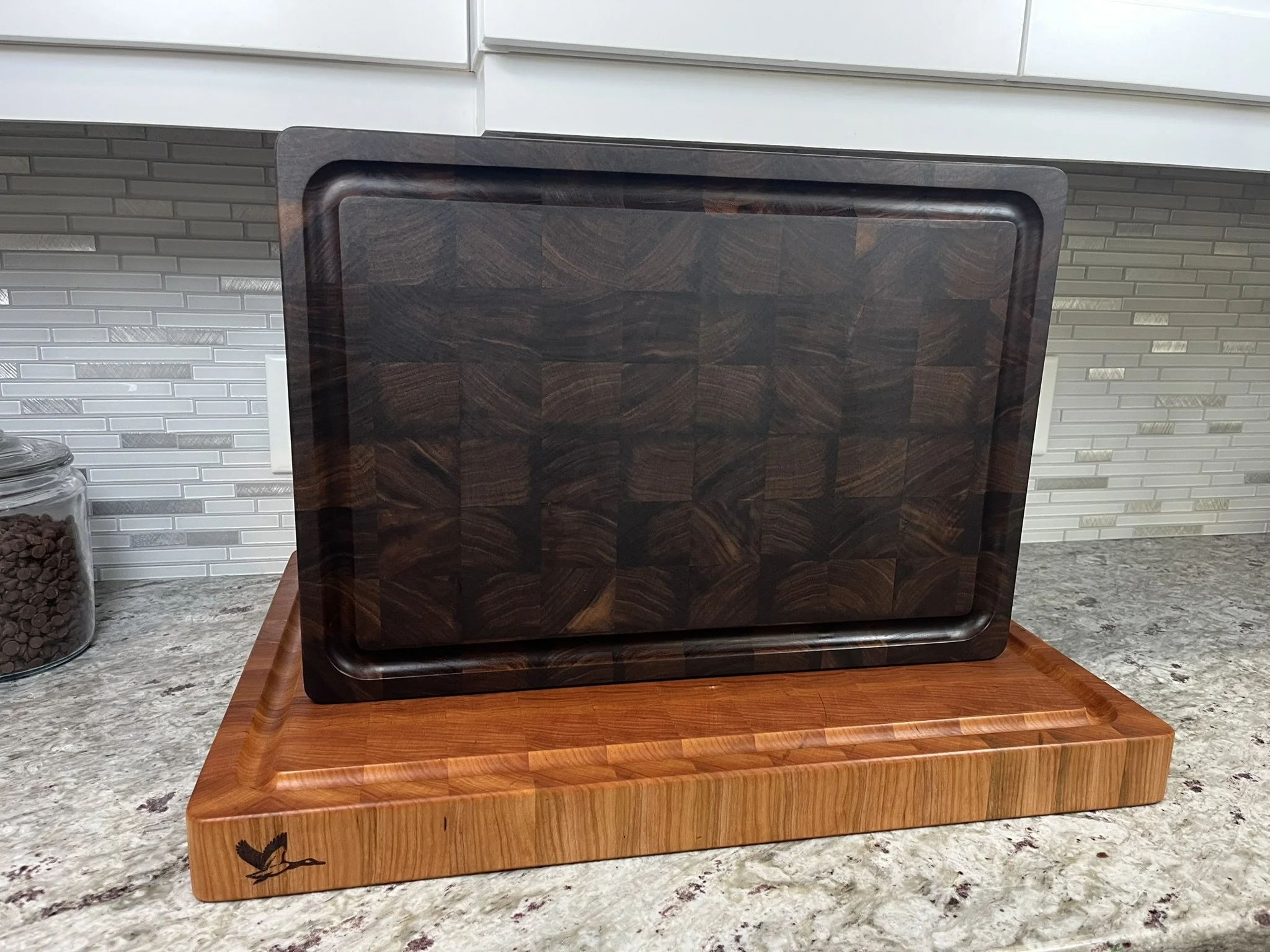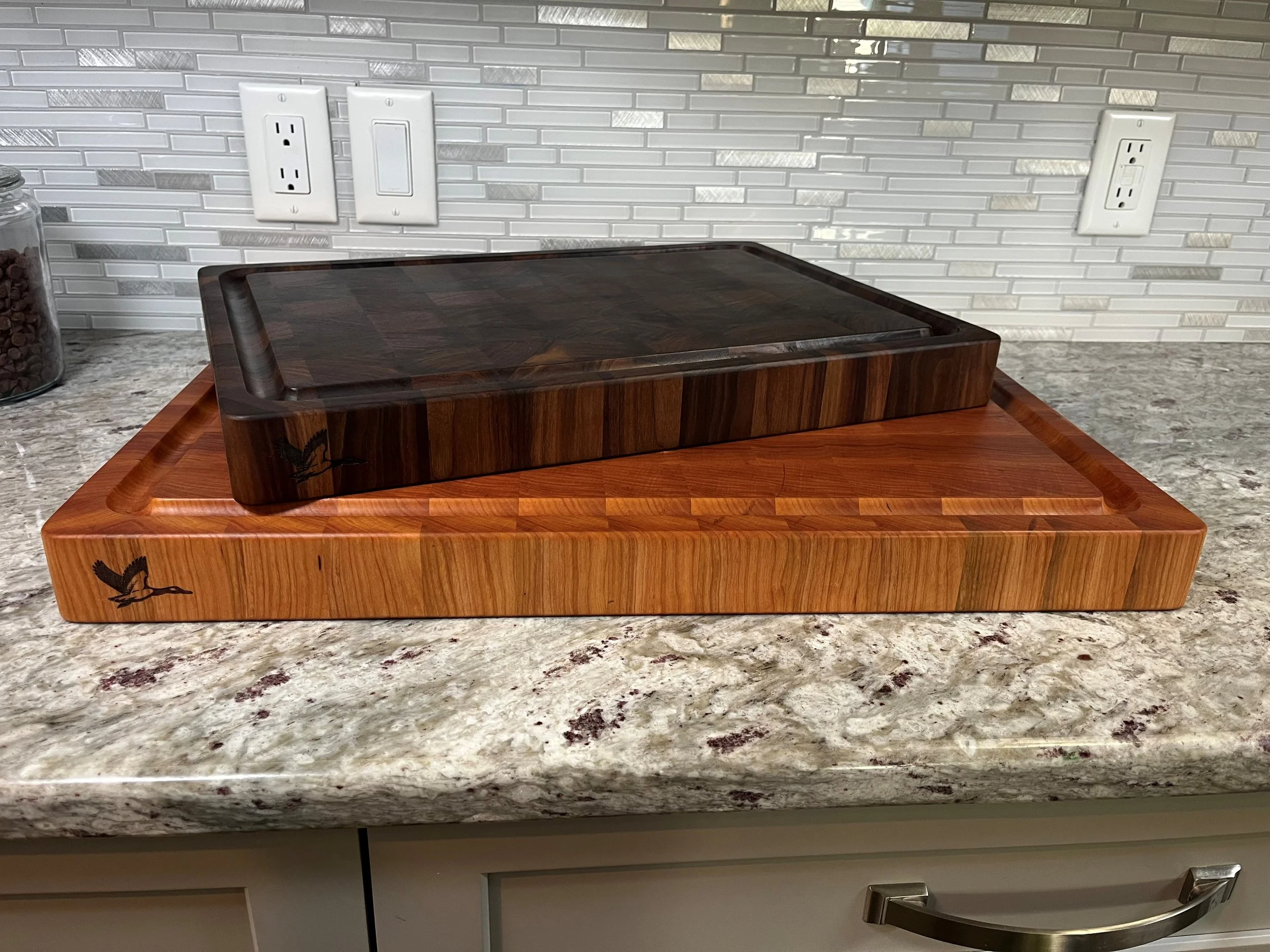 End Grain boards are assembled from small wood blocks oriented so the ends of the fibers face upward, producing a checkerboard OR STAGGERED BRICK appearance. While checkerboard patterns are harder to craft, we make the majority of our boards this way because we believe it maximizes the aesthetic appeal of the board.
