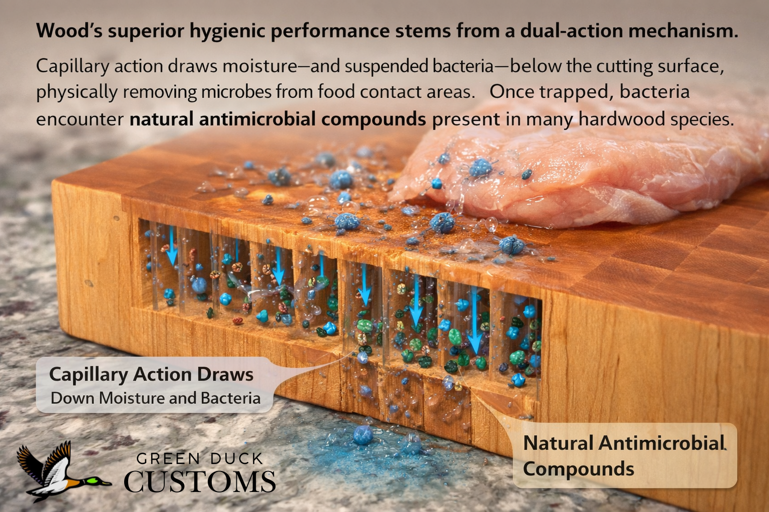 Wood’s superior hygienic performance stems from a dual-action mechanism. First, capillary action draws moisture—and suspended bacteria—below the cutting surface, physically removing microbes from food contact areas.² Second, once trapped, bacteria encounter natural antimicrobial compounds present in many hardwood species. Multiple studies have demonstrated that hardwoods such as maple inhibit bacterial survival.² Because bacteria cannot multiply within the wood structure, they die naturally.⁶ This combination of physical isolation and chemical inhibition makes wood more forgiving than plastic when minor sanitation lapses occur.¹